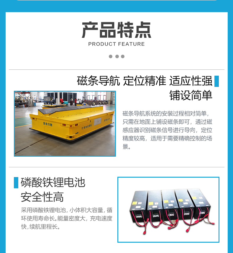 描   述: 智杰優(yōu)搬運(yùn)為管道制造業(yè)研發(fā)生產(chǎn)的35噸重載AGV,平臺(tái)長(zhǎng)4.5米寬2.8米高0.9米額定載重35噸,客戶(hù)主要用于大型鋼管的搬運(yùn)作業(yè)。臺(tái)面定制V型置物架設(shè)置橡膠防滑墊增加接觸面積,防止鋼管在運(yùn)輸過(guò)程中滾落。該車(chē)采用磁條導(dǎo)航,根據(jù)地面鋪設(shè)磁條進(jìn)行循跡行走,運(yùn)行路線設(shè)置AB兩個(gè)站點(diǎn),可通過(guò)操作按鈕自動(dòng)運(yùn)行至A站或B站,也可通過(guò)無(wú)線遙控操作AGV搬運(yùn)車(chē)運(yùn)行,輪系配備四組雙差速舵輪,伺服電機(jī)行星減速機(jī)***控