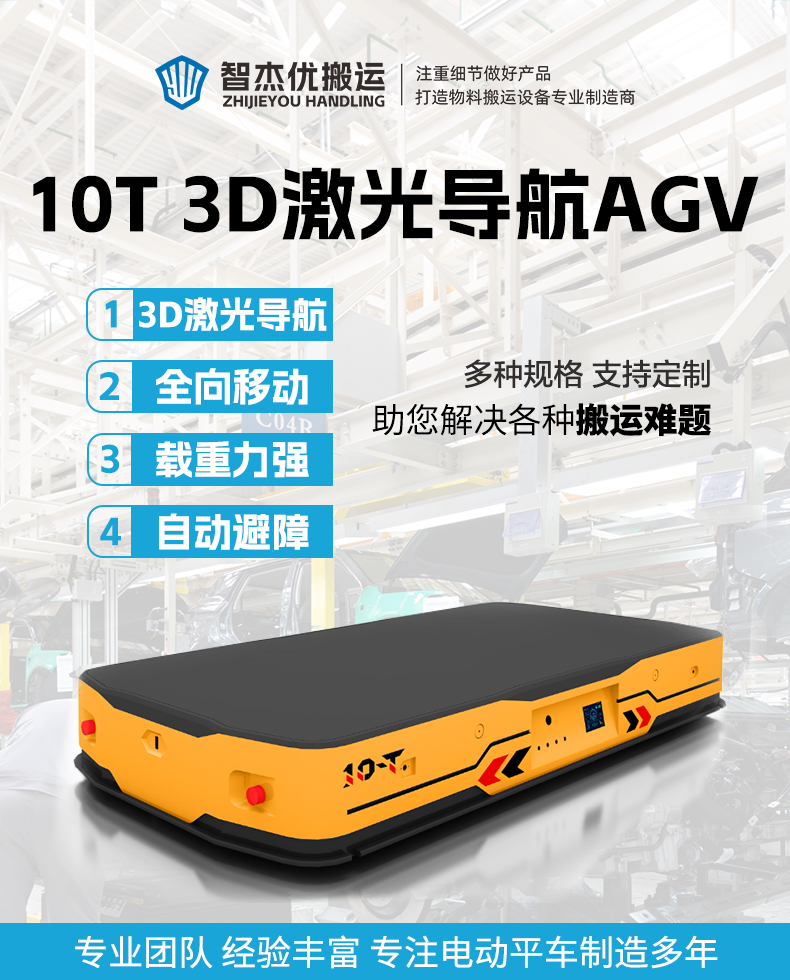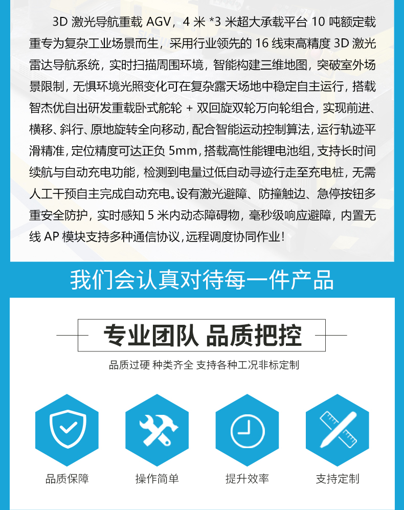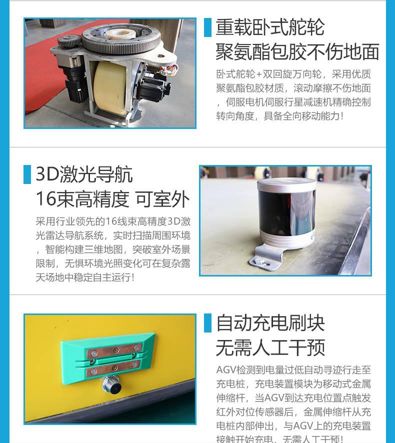 描   述: 3D激光導(dǎo)航重載AGV,4米*2米超大承載平臺(tái)10噸額定載重專為復(fù)雜工業(yè)場景而生,采用行業(yè)***的16線束高精度3D激光雷達(dá)導(dǎo)航系統(tǒng),實(shí)時(shí)掃描周圍環(huán)境,智能構(gòu)建三維地圖,突破室外場景限制,無懼環(huán)境光照變化可在復(fù)雜露天場地中穩(wěn)定自主運(yùn)行,搭載智杰優(yōu)自出研發(fā)重載臥式舵輪+雙回旋雙輪萬向輪組合,實(shí)現(xiàn)前進(jìn)、橫移、斜行、原地旋轉(zhuǎn)全向移動(dòng),配合智能運(yùn)動(dòng)控制算法,運(yùn)行軌跡平滑***,定位精度可達(dá)正負(fù)5mm。