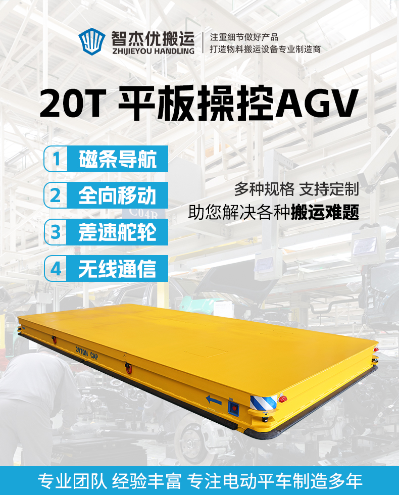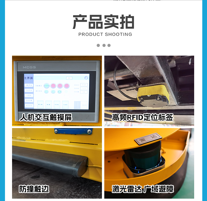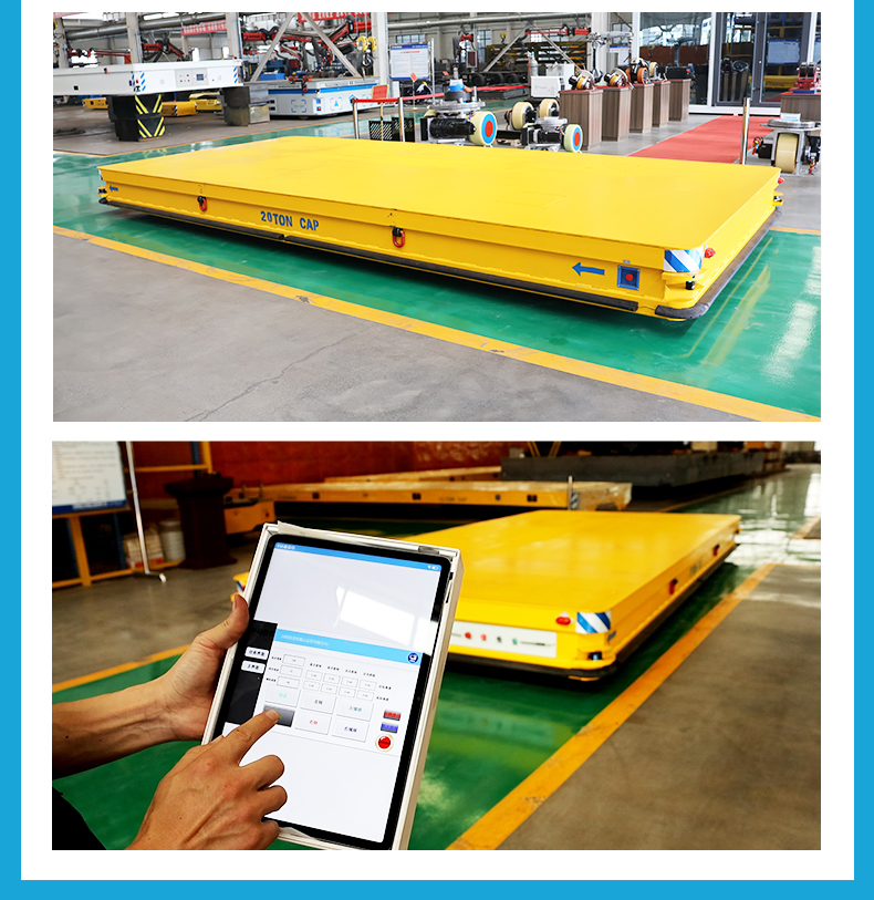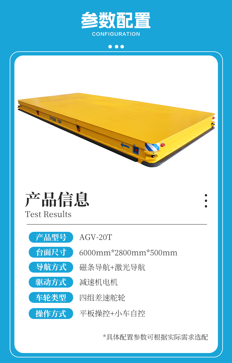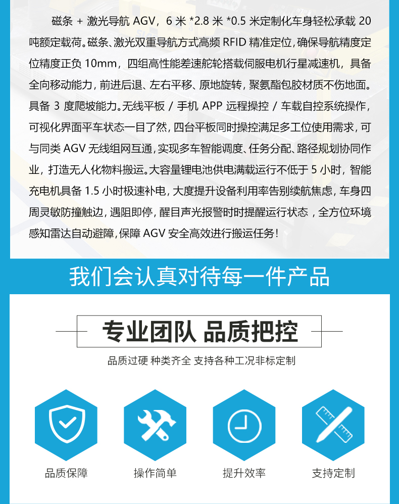 描   述: 磁條+激光導(dǎo)航AGV,6米*2.8米*0.5米定制化車(chē)身輕松承載20噸額定載荷。磁條、激光雙重導(dǎo)航方式高頻RFID***定位,確保導(dǎo)航精度定位精度正負(fù)10mm,四組高性能差速舵輪搭載伺服電機(jī)行星減速機(jī),具備全向移動(dòng)能力,前進(jìn)后退、左右平移、原地旋轉(zhuǎn),聚氨酯包膠材質(zhì)不傷地面。具備3度爬坡能力。無(wú)線(xiàn)平板/手機(jī)APP遠(yuǎn)程操控/車(chē)載自控系統(tǒng)操作,可視化界面平車(chē)狀態(tài)一目了然,四臺(tái)平板同時(shí)操控滿(mǎn)足多工位使用需求