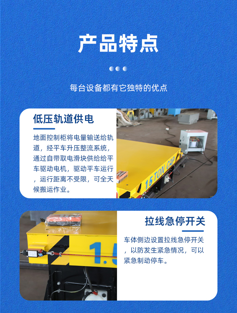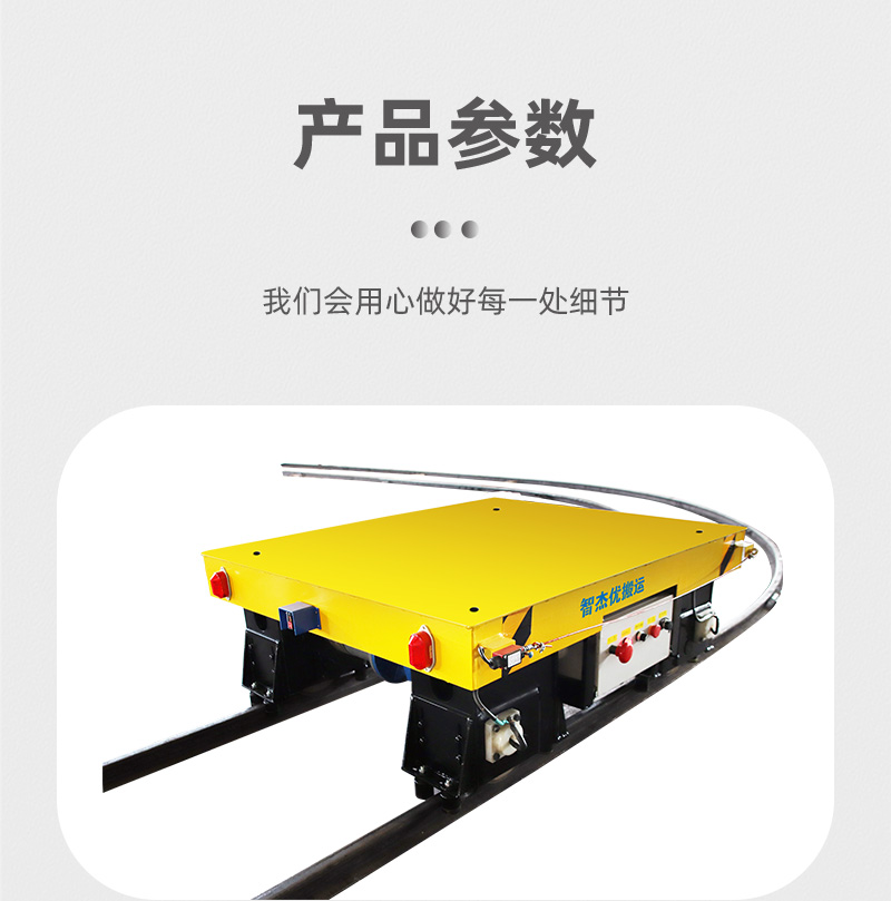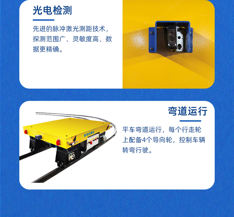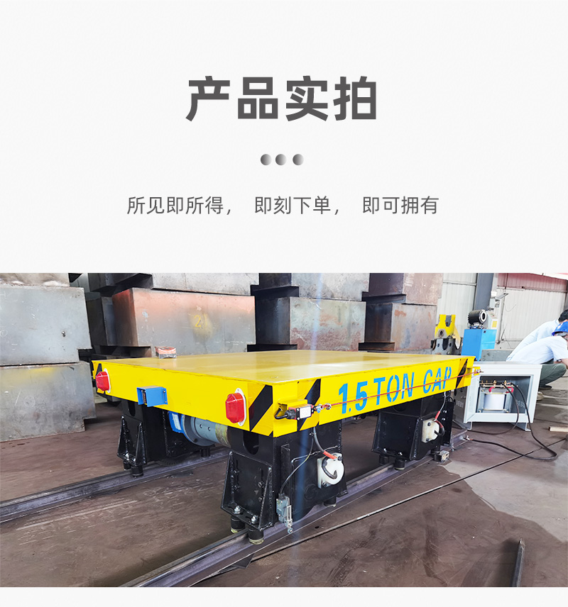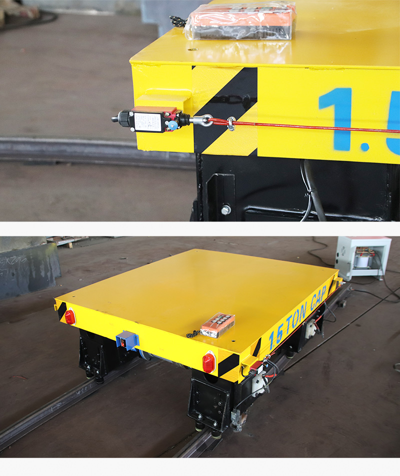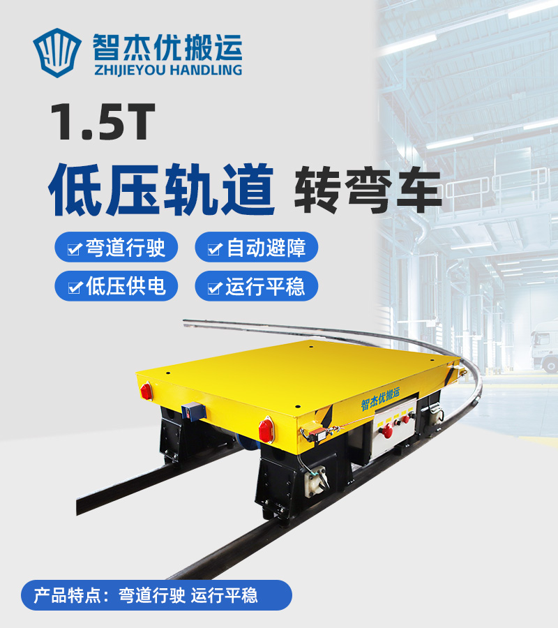 轉彎軌道電動平車,整車長1.4米寬1.2米高0.5米載重1.5噸,采用低壓軌道供電方式為平車提供電力,通過地面控制柜將電纜線連接軌道,再經(jīng)平車升壓整流系統(tǒng)輸送給牽引電機,驅動平車運行,車輪均做絕緣處理確保沒有觸電風險,該種供電方式不受續(xù)航能力限制,可根據(jù)需要靈活調整線路及搬運任務,人工無線遙控操作,車體側邊設置拉線急停開關,前后配備光電檢測,確保行車安全。