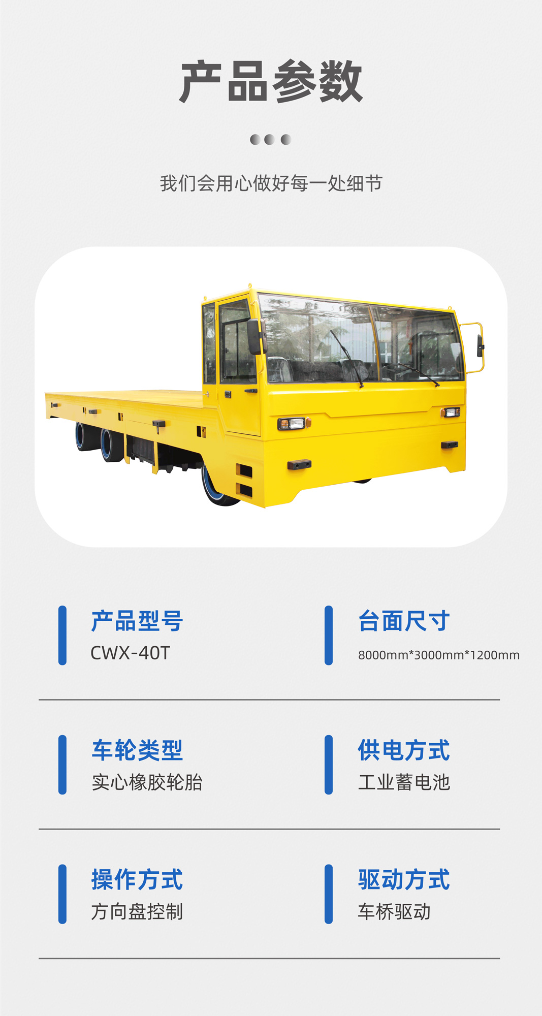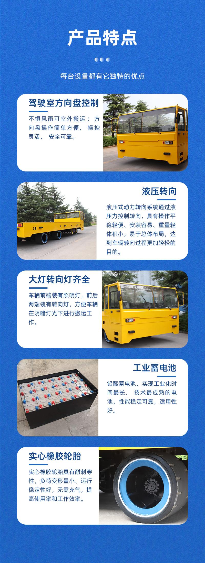 廠區(qū)大型駕駛室方向盤式無(wú)軌電動(dòng)搬運(yùn)車,整車長(zhǎng)8米,寬3米高1.2米,箱梁結(jié)構(gòu)承重力強(qiáng)載重40噸,主要用于鋼管、板材等重型物料的搬運(yùn)工作,2臺(tái)大功率電機(jī)啟動(dòng)力足,動(dòng)力強(qiáng)勁,爬坡能力強(qiáng),通過(guò)控制方向盤和加速踏板來(lái)實(shí)現(xiàn)靈活操控,簡(jiǎn)單方便上手快,蓄電池供電節(jié)能環(huán)保無(wú)污染,液壓轉(zhuǎn)向輕松平穩(wěn),轉(zhuǎn)彎靈活,6個(gè)實(shí)心橡膠輪胎承載力強(qiáng),負(fù)荷變形量小,防滑耐磨耐刺穿適應(yīng)多種路面行駛,車身底盤高、通過(guò)性良好,適合廠區(qū)遠(yuǎn)距離大型、重型物料轉(zhuǎn)運(yùn)使用!