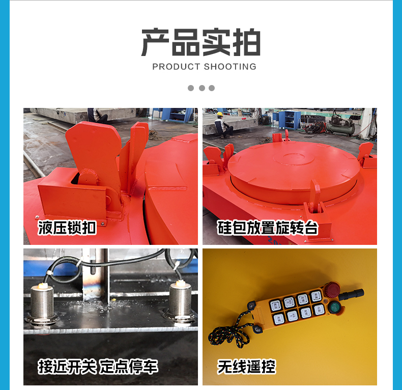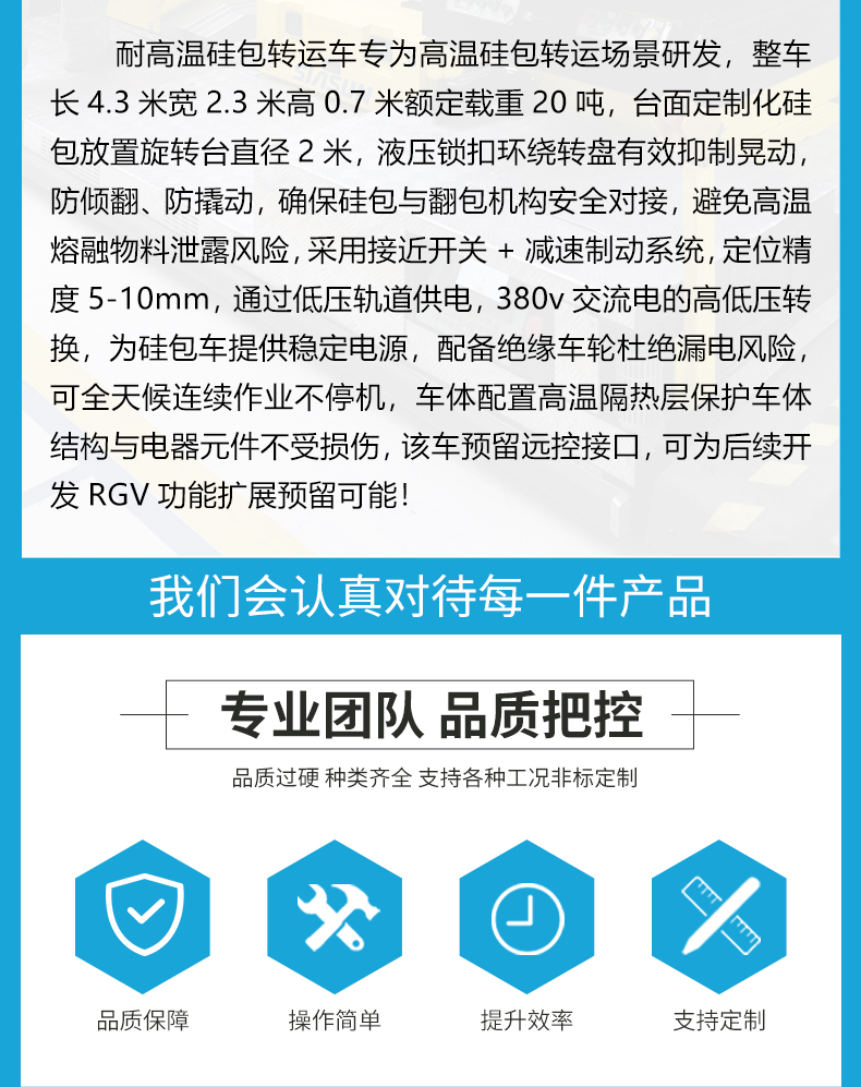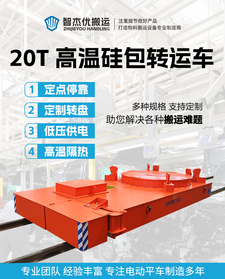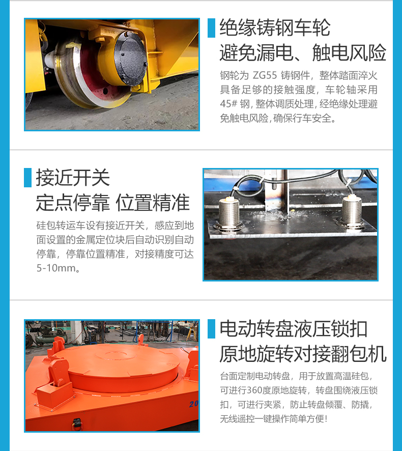 描   述: 耐高溫硅包轉(zhuǎn)運(yùn)車專為高溫硅包轉(zhuǎn)運(yùn)場(chǎng)景研發(fā),整車長(zhǎng)4.3米寬2.3米高0.7米額定載重20噸,臺(tái)面定制化硅包放置旋轉(zhuǎn)臺(tái)直徑2米,液壓鎖扣環(huán)繞轉(zhuǎn)盤有效抑制晃動(dòng),防傾翻、防撬動(dòng),確保硅包與翻包機(jī)構(gòu)安全對(duì)接,避免高溫熔融物料泄露風(fēng)險(xiǎn),采用接近開關(guān)+減速制動(dòng)系統(tǒng),定位精度5-10mm,通過(guò)低壓軌道供電,380v交流電的高低壓轉(zhuǎn)換,為硅包車提供穩(wěn)定電源,配備絕緣車輪杜絕漏電風(fēng)險(xiǎn),可全天候連續(xù)作業(yè)不停機(jī)!