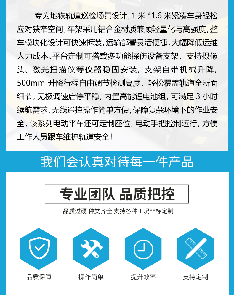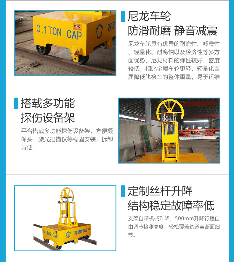 描   述: 專為地鐵軌道巡檢場景設(shè)計(jì),1米*1.6米緊湊車身輕松應(yīng)對狹窄空間,車架采用鋁合金材質(zhì)兼顧輕量化與高強(qiáng)度,整車模塊化設(shè)計(jì)可快速拆裝,運(yùn)輸部署靈活便捷,大幅降低運(yùn)維人力成本。平臺定制可搭載多功能探傷設(shè)備支架,支持?jǐn)z像頭、激光掃描儀等儀器穩(wěn)固安裝,支架自帶機(jī)械升降,500mm升降行程自由調(diào)節(jié)檢測高度,輕松覆蓋軌道全斷面細(xì)節(jié),無極調(diào)速啟停平穩(wěn),內(nèi)置高能鋰電池組,可滿足3小時續(xù)航需求,無線遙控操作簡單方便,