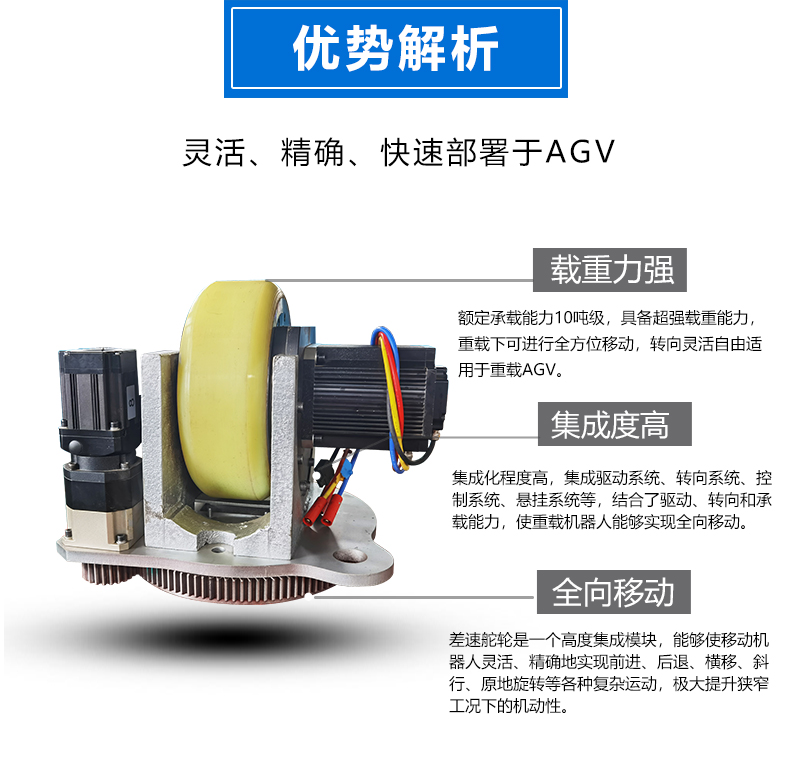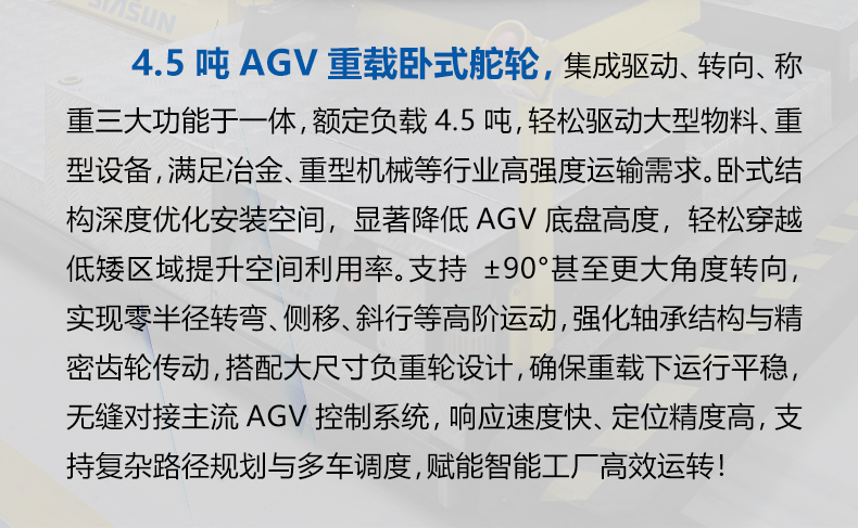 描   述: 4.5噸級(jí)重載臥式舵輪,集成驅(qū)動(dòng)、轉(zhuǎn)向、稱重三大功能于一體,額定負(fù)載高達(dá)4.5噸,輕松驅(qū)動(dòng)大型物料、重型設(shè)備,滿足冶金、重型機(jī)械等行業(yè)高強(qiáng)度運(yùn)輸需求。臥式結(jié)構(gòu)深度優(yōu)化安裝空間,顯著降低AGV底盤高度,輕松穿越低矮區(qū)域提升空間利用率。支持±90°甚至更大角度轉(zhuǎn)向,實(shí)現(xiàn)零半徑轉(zhuǎn)彎、側(cè)移、斜行等高階運(yùn)動(dòng)!