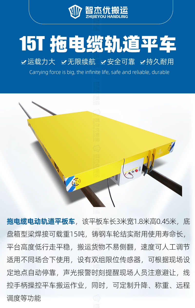 描   述: 這是一臺拖電纜電動軌道平板車,長3米,寬1.8米,高0.45米,行走平穩(wěn),不易側(cè)翻,速度可人工調(diào)節(jié),設(shè)有雙組限位傳感器,定點自動???,聲光報警提醒避讓,線控手柄操控平車搬運作業(yè),同時,可定制升降、稱重、遠程調(diào)度等功能