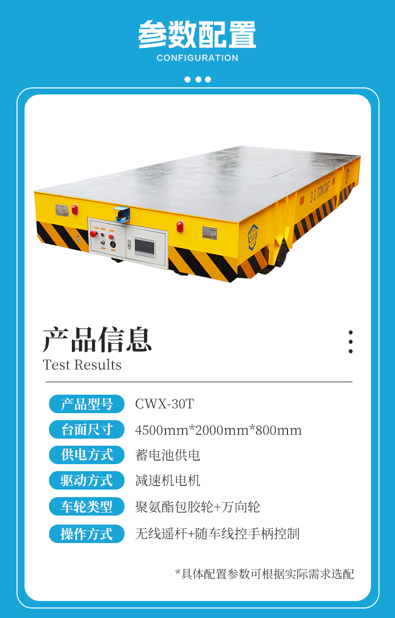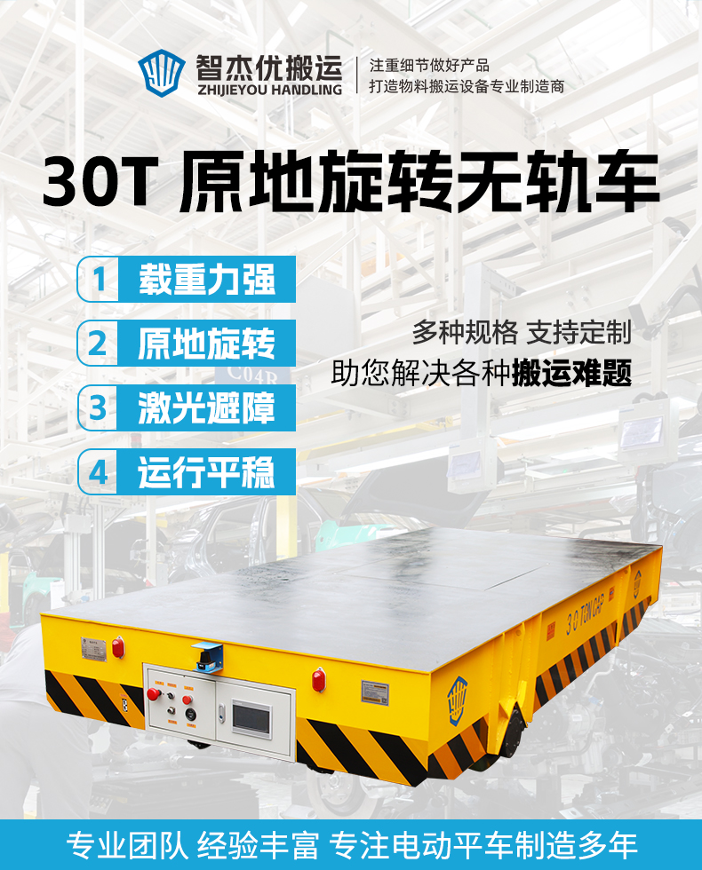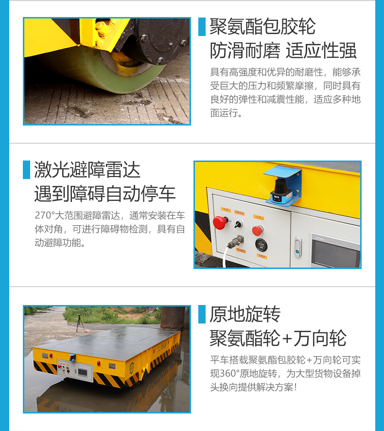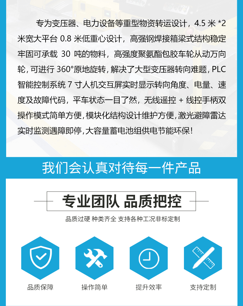 描   述: 專(zhuān)為變壓器、電力設(shè)備等重型物資轉(zhuǎn)運(yùn)設(shè)計(jì),4.5米*2米寬大平臺(tái)0.8米低重心設(shè)計(jì),高強(qiáng)鋼焊接箱梁式結(jié)構(gòu)穩(wěn)定牢固可承載30噸的物料,高強(qiáng)度聚氨酯包膠車(chē)輪從動(dòng)萬(wàn)向輪,可進(jìn)行360°原地旋轉(zhuǎn),解決了大型變壓器轉(zhuǎn)向難題,PLC智能控制系統(tǒng)7寸人機(jī)交互屏實(shí)時(shí)顯示轉(zhuǎn)向角度、電量、速度及故障代碼,平車(chē)狀態(tài)一目了然,無(wú)線遙控+線控手柄雙操作模式簡(jiǎn)單方便,模塊化結(jié)構(gòu)設(shè)計(jì)維護(hù)方便,激光避障雷達(dá)實(shí)時(shí)監(jiān)測(cè)遇障即停!