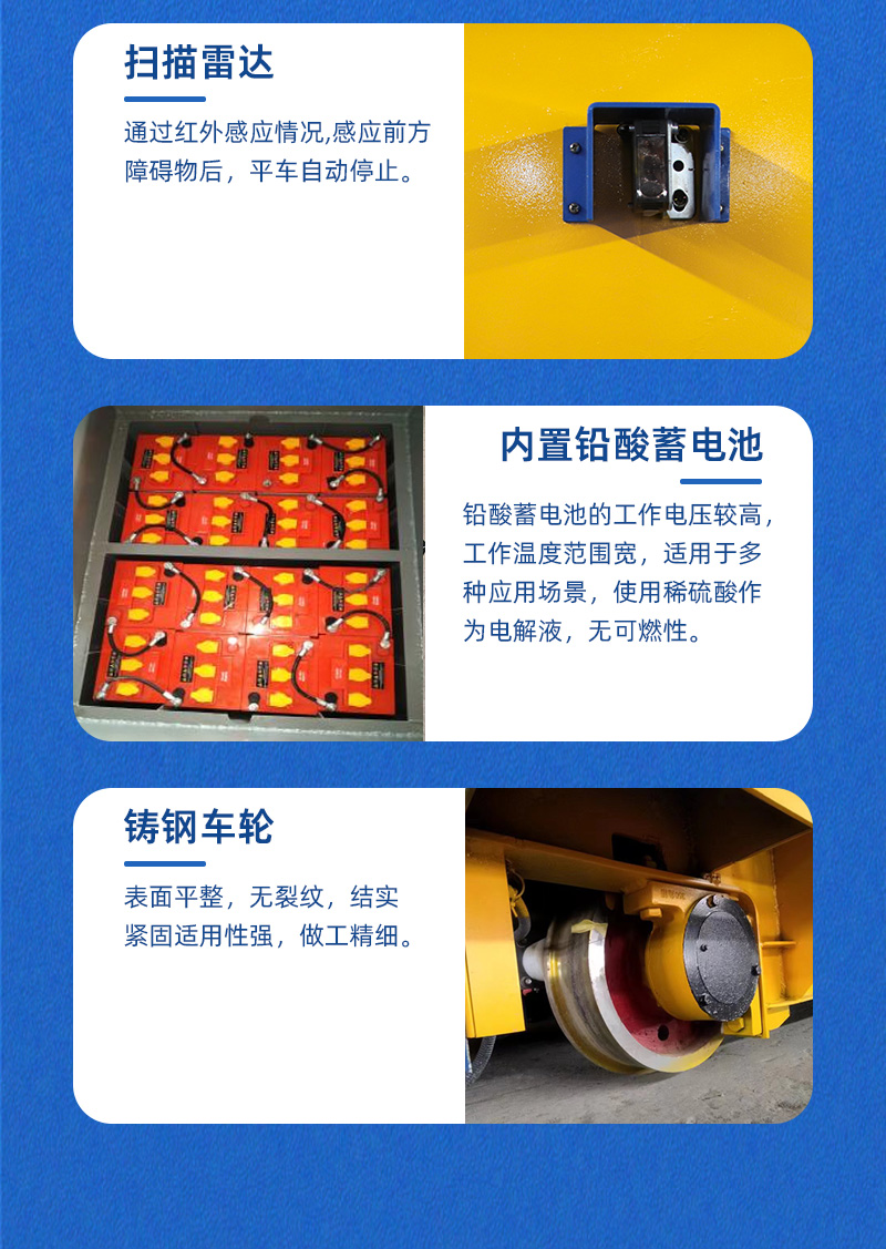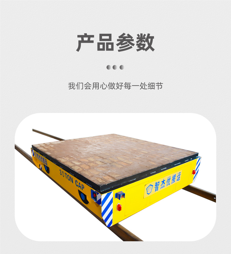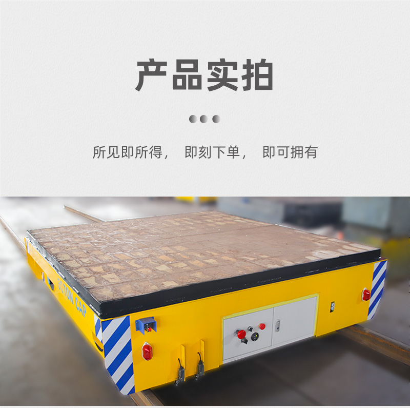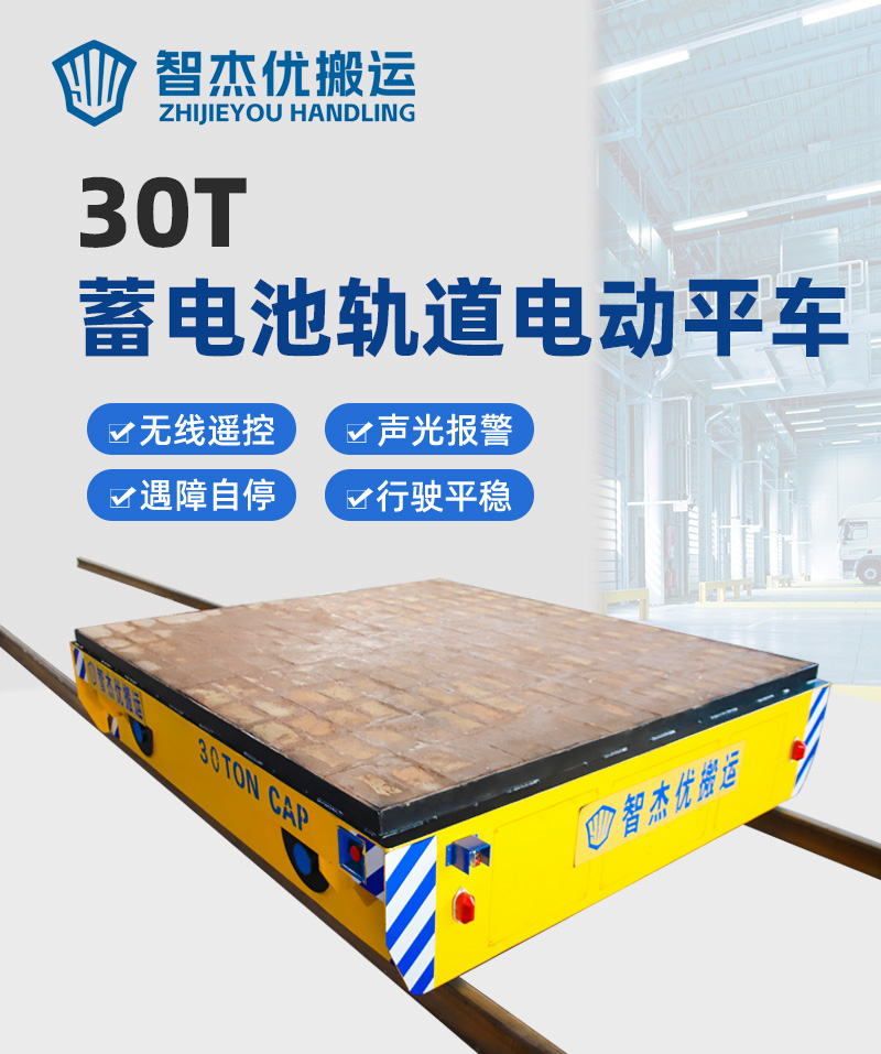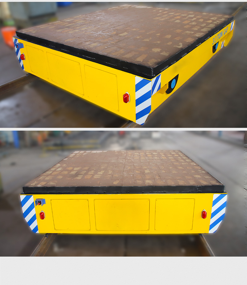 描   述: 這是一臺(tái)山東客戶(hù)定制的蓄電池軌道電動(dòng)平車(chē),該車(chē)長(zhǎng)2.5米,寬2.2米,高0.5米,車(chē)架箱型梁焊接,結(jié)構(gòu)牢固,載重量大,可載重30噸,應(yīng)客戶(hù)使用要求,臺(tái)面鋪設(shè)耐火磚;平車(chē)采用蓄電池供電,運(yùn)行距離不受限制,遙控器一鍵操作,可啟動(dòng)停止、前進(jìn)后退、調(diào)速等,設(shè)有雙限位開(kāi)關(guān),可根據(jù)現(xiàn)場(chǎng)設(shè)定地點(diǎn)自動(dòng)???,前后光電檢測(cè),遇障自停,聲光報(bào)警保障安全,能夠在垂直軌道、L型軌道、S型軌道、弧形軌道及易爆、擺渡場(chǎng)合使用。