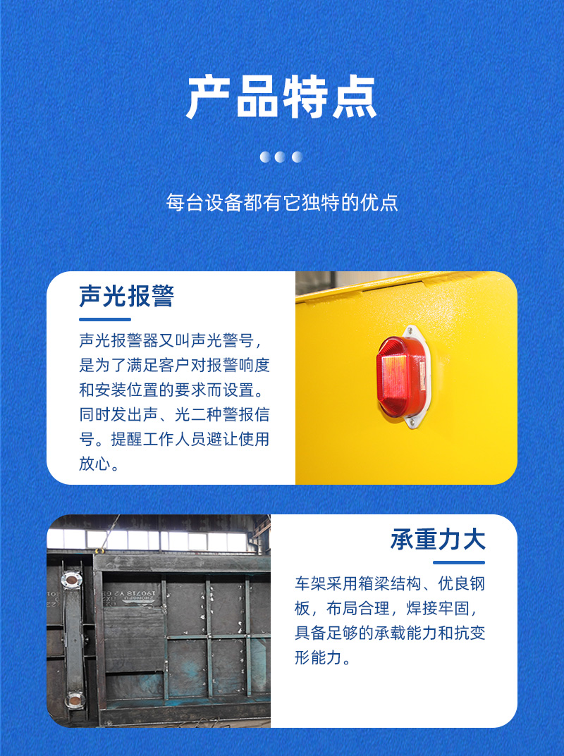 公司保障:電動(dòng)平車、軌道平車的承重安全系數(shù)不低于60%