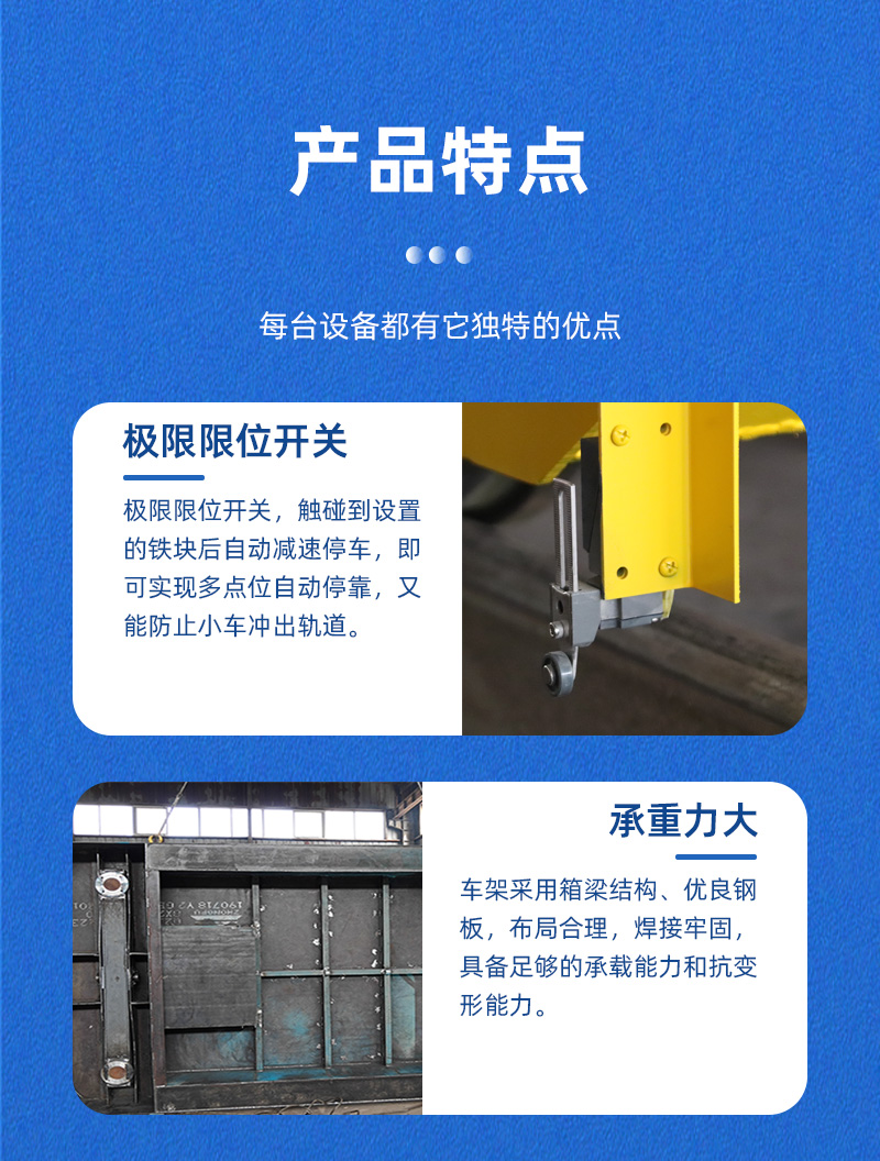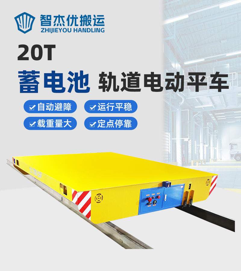 智杰優(yōu)搬運(yùn)為設(shè)備制造業(yè)設(shè)計(jì)生產(chǎn)的蓄電池軌道平板車,長(zhǎng)3米寬2.4米高0.45米額定載重20噸,主要用于設(shè)備生產(chǎn)線大型設(shè)備零部件的轉(zhuǎn)運(yùn)作業(yè),蓄電池供電續(xù)航時(shí)間長(zhǎng),采用無線遙控、線控手柄兩種操作方式,平車車架箱梁結(jié)構(gòu)穩(wěn)定載重力強(qiáng),設(shè)有限位開關(guān),可實(shí)現(xiàn)軌道車定點(diǎn)??堪徇\(yùn)作業(yè),同時(shí)極限限位防止小車沖出軌道,平車具有欠壓、過壓、過流、超載、短路、低電量等防護(hù),前后光電檢測(cè)自動(dòng)避障,聲光報(bào)警急停開關(guān)確保平車安全平穩(wěn)運(yùn)輸作業(yè)!